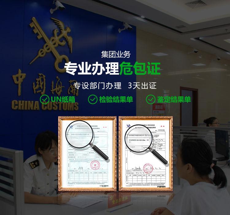 危包证全称《出入境货物包装性能检验结果单》,简称“危包证”"危包证”用于危险品出口专用纸箱主要用于国家规定出口要申请危险品包装的产品,如:化妆品类的环氧胶、爽肤水、指甲油、香水、电发水、喷雾、鲤电池、打火机等。
